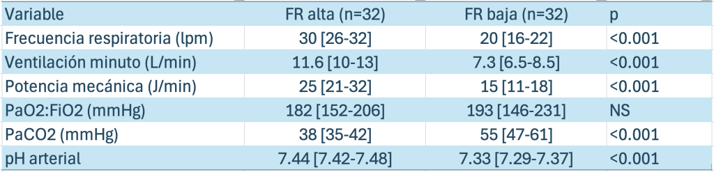 El protocolo se pudo implementar en todos los pacientes, obteniendo 10 puntos de diferencia en la frecuencia respiratoria (FR) (Tabla). La mediana de FR durante la ventilación con FR baja y alta fue de 20 [16-22] vs 30 [26-32] respiraciones/min (p < 0,001), y se asoció a una menor ventilación minuto (7,3 [6,5-8,5] vs 11,6 [10-13] L/min [p < 0,001]) y un menor Mechanical power (15 [11-18] vs a 25 [21-32] J/min [p < 0,001]).