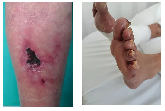 Extremidades inferiores: sin edema ni signos de TVP, pulsos periféricos ++/+++ simétricos. Se aprecia una lesión necrótica en zona pretibial derecha y en los ortejos de ambos pies.