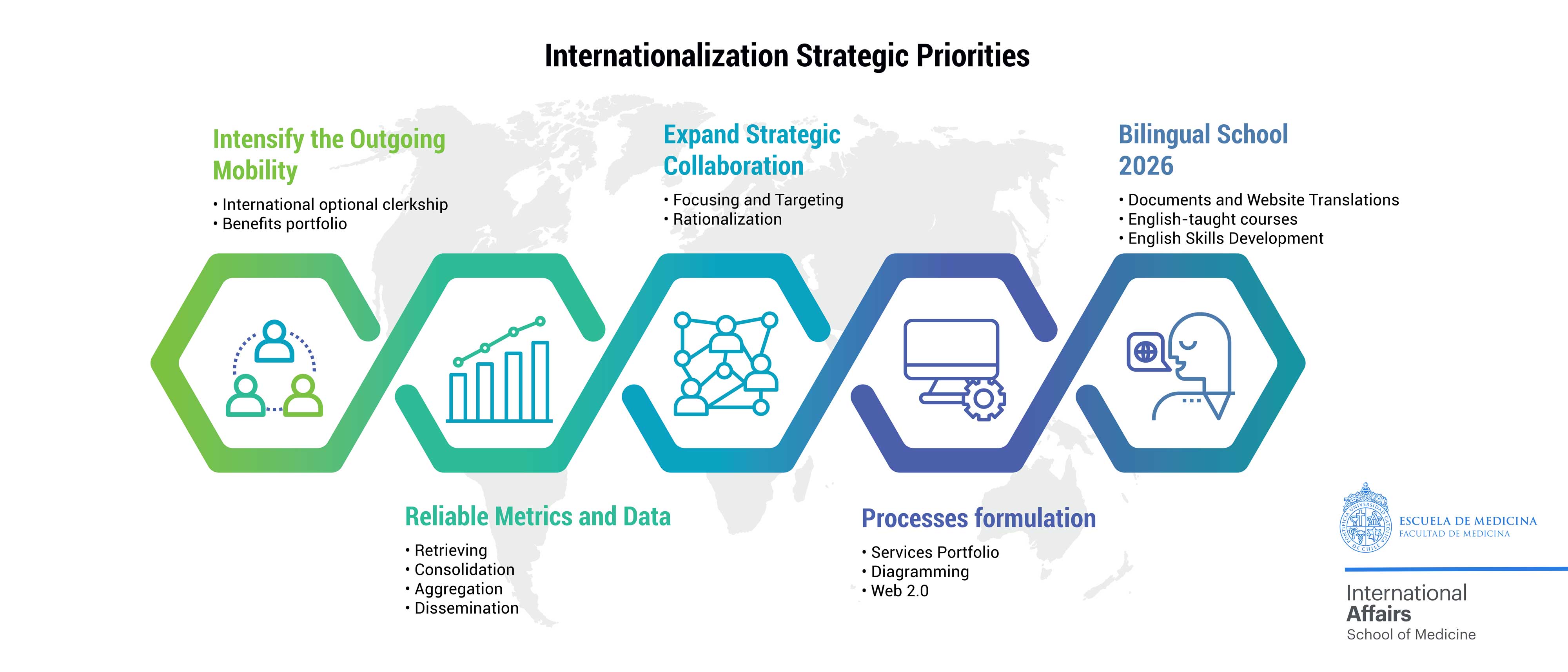We aim to collaborate and participate in the international medical field by defining and establishing strategic partnerships in order to give UC medical school students, academics and researchers the possibility to grow in their academic areas and their values.