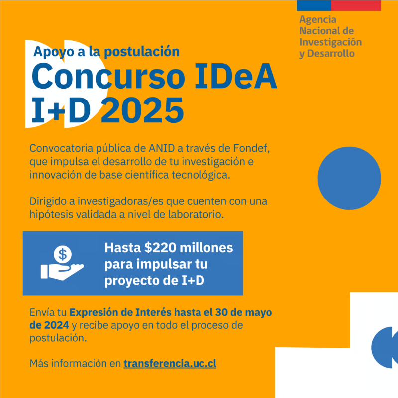 Invitamos a la Comunidad UC a expresar su interés en participar de la convocatoria del concurso Fondef IDeA I+D 2025. Al enviar su Expresión de Interés, recibirán apoyo de la Dirección de Transferencia y Desarrollo UC en todo el proceso de postulación.