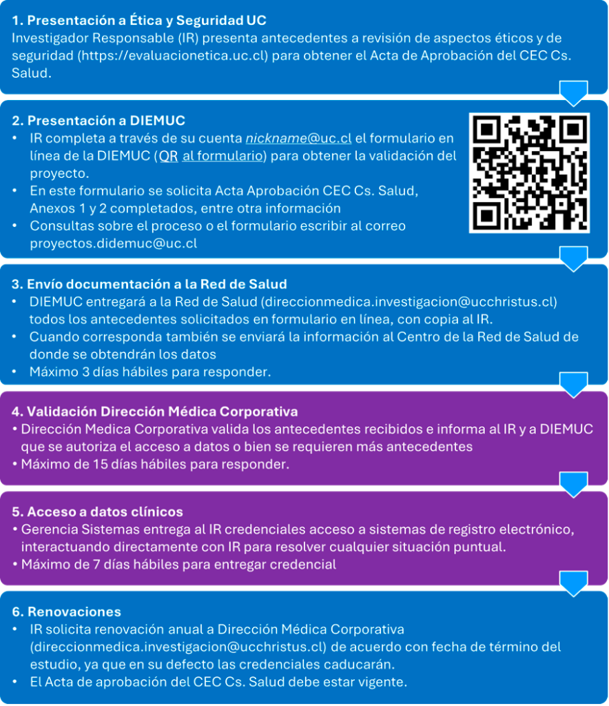 Informamos que ya está implementada la Política y Procedimiento para acceder a datos clínicos de la Red de Salud UC-CHRISTUS para usos secundarios, y en el contexto de proyectos de investigación y tesis de investigación de la Escuela de Medicina este proceso considera los siguientes pasos:
