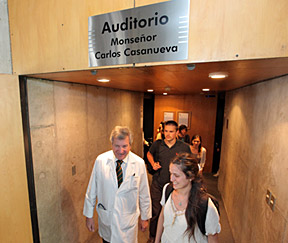 Durante la ceremonia, el capellán del Hospital Clínico UC, padre Sebastián Muñoz, bendijo los cuadros de ambos homenajeados, los que estarán en cada uno de los auditorios que llevarán sus respectivos nombres.
