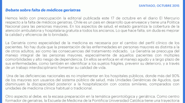 Deptartamento de Medicina Interna – Geriatría, de la Facultad de Medicina UC da a conocer su visión respecto a los desafíos en torno a la geriatría en nuestro país. Los invitamos a leer en profundidad el siguiente documento: