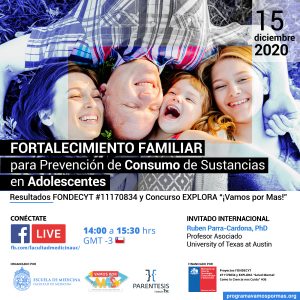 El seminario contará con la participación del Dr. Rubén Parra-Cardona, Profesor Asociado de la Universidad de Texas-Austin, quien presentará la importancia del tema, a lo que seguirá la presentación de los resultados de estos proyectos y una mesa abierta de discusión a la que se invitó a representantes del Servicio Nacional para la Prevención y Rehabilitación para la prevención del Consumo de Drogas y Alcohol (SENDA), para conversar de la aplicación de programas de fortalecimiento familiar como políticas públicas del país.