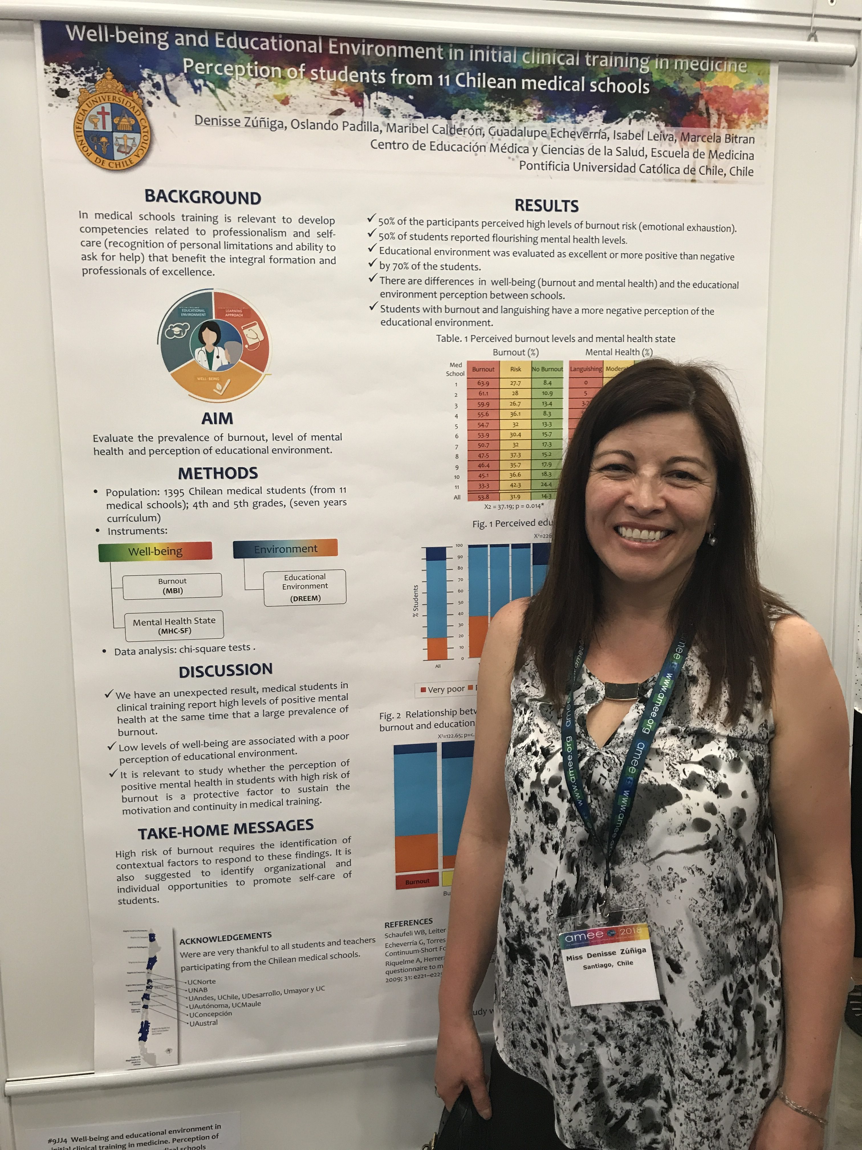 El trabajo presentado por la Dra. Marcela Bitrán en el congreso de la Asociación Europea de la Educación Médica (AMEE) 2018, realizado en Suiza, recibió el premio Medical Teacher Top 3 Poster Award. Dicho estudio trata del desgaste (burnout) que sufren los estudiantes de medicina durante su formación.