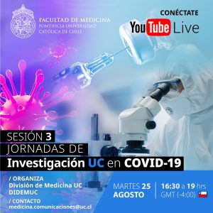 La tercera sesión se realizará este martes 18 de agosto desde las 16.30 a las 19.00 horas (GMT-4) a través de la plataforma Zoom para la comunidad UC y además será transmitida en el canal de YouTube de Facultad de Medicina UC para todo aquel que quiera conectarse. Se continuarán presentando los proyectos con financiamiento interno y los estudios con financiamiento externo como proyectos ANID y Sofofa Hub.