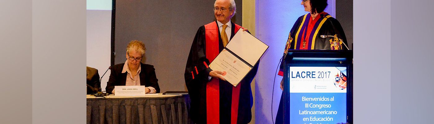 El Decano Dr. Luis Ibáñez Anrique recibió el título de Miembro Honorario durante la inauguración del Congreso Latinoamericano en Educación de Residentes (LACRE), realizado en Santiago el 24-25 y 26 de mayo. El reconocimiento fue otorgado por la presidenta del Royal College of Physicians and Surgeons of Canada, Dra. Françoise Chagnon.
