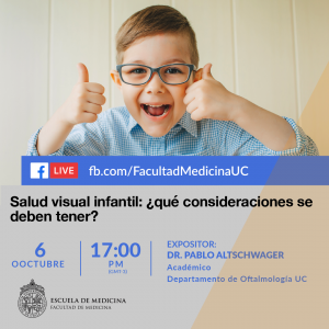 Este martes 6 de octubre desde las 17.00 horas, estaremos junto al doctor Pablo Altschwager conversando sobre la salud visual en los niños y niñas a través de un Facebook Live desde el fanpage de la Facultad de Medicina UC.