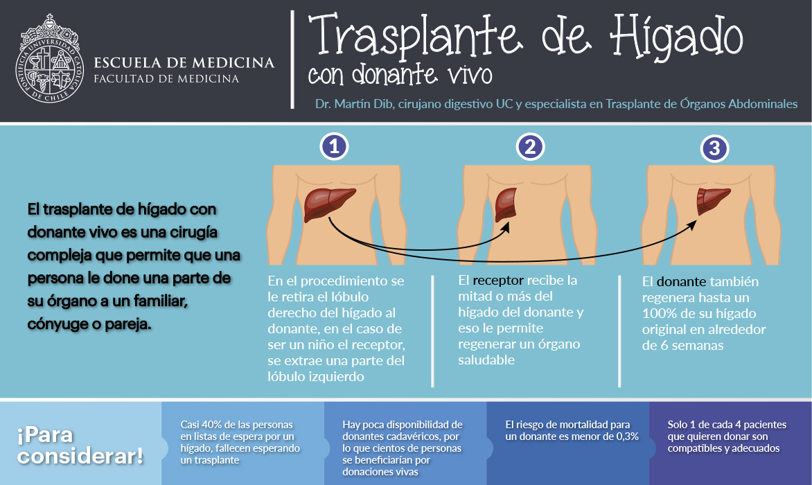 La disponibilidad de órganos cadavéricos sigue siendo baja en Chile, por lo que resulta clave dar a conocer que el trasplante con donante vivo, común en el caso del riñón, también se realiza para el hígado. En el procedimiento se retira una porción de este órgano para donarlo al paciente, y en ambos casos, el hígado se regenera hasta un 100%.
