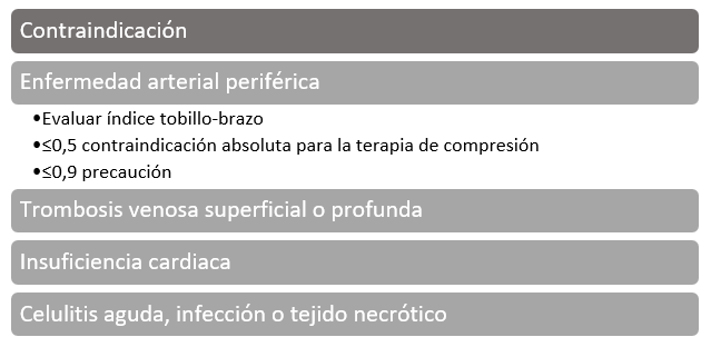 Considerado elemento fundamental para el tratamiento de insuficiencia venosa crónica. Existe el vendaje compresivo que se usa generalmente de forma inicial y pierde presión tras colocación. Luego están las medias de compresión que deben ser usadas todos los días y estas ejercen su máxima presión en el tobillo y disminuye hacia proximal de manera progresiva4.