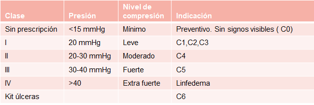 Tabla 1. Niveles de presión de medias compresivas según la clasificación C de CEAP