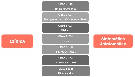 En la primera parte de Clínica hay 7 subclases, desde C0 (sin signos visibles) hasta C6 (úlceras activas). Se le puede agregar “A” de asintomático o “S” de sintomático (Figura 2). Lo que más se usa para el manejo es la C. En Etiología puede ser congénita, primaria o secundaria. En Anatomía puede ser en venas profundas, superficiales o perforantes; y en patofisiología puede ser por reflujo o por obstrucción4.
