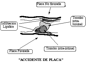 – Otras placas poseen un alto contenido graso y de macrófagos, y su evolución se caracteriza por mayor incidencia de accidentes agudos, como consecuencia de ruptura, hemorragias y trombosis sobre la placa («accidente de placa»). Su traducción clínica más característica es el infarto del miocardio y la angina inestable.