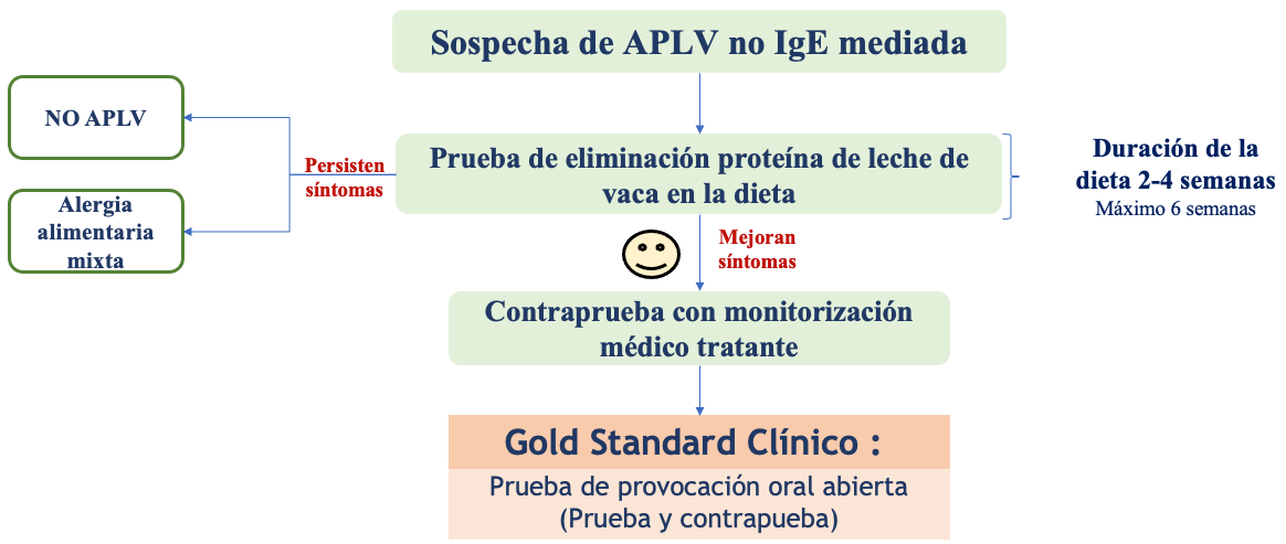 Si la sospecha clínica apunta a una APLV no mediada por IgE se procede a realizar un estudio clínico, que resume en el siguiente algoritmo: