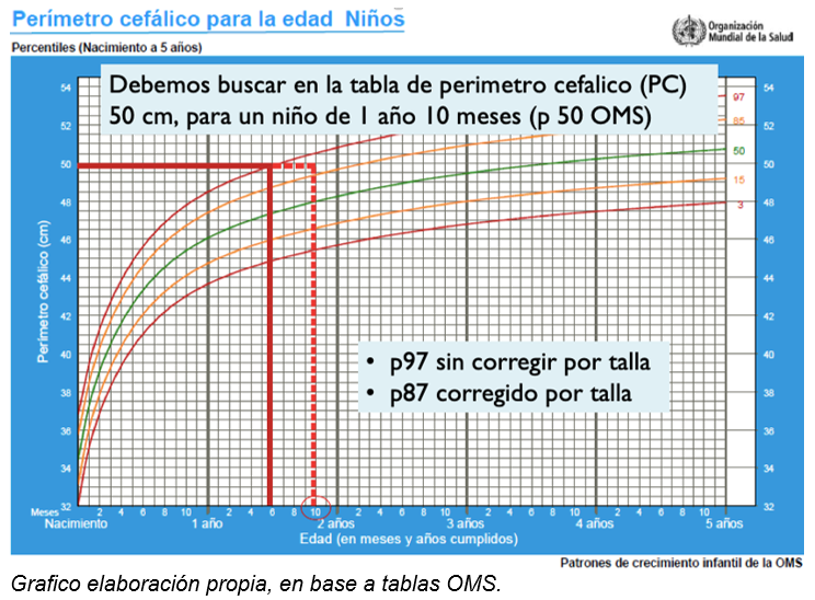Una vez obtenido el valor de perímetro craneano, se debe ajustar este valor según la talla (tabla OMS), esto con el fin de no sobre ni subestimar el tamaño de la cabeza. Se consideran dentro del rango los PC que se encuentran entre el percentil 5 y 95 corregidos por talla (2).