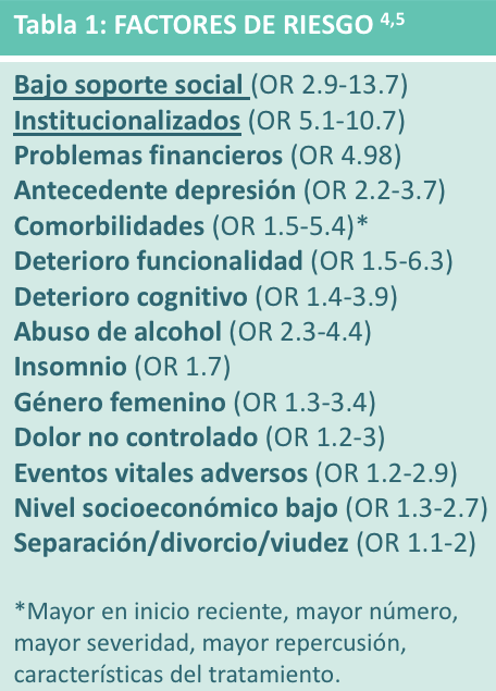 Adultos mayores con depresión tienen mayor mortalidad, mayor riesgo suicida, mayor riesgo de recurrencia de depresión, más demencia, peor evolución en comorbilidades, mayor discapacidad y menor calidad de vida, más consultas ambulatorias y de urgencia, hospitalizaciones más prolongadas, mayor riesgo de consumo de fármacos, alcohol y drogas.4,6,7,8,9
