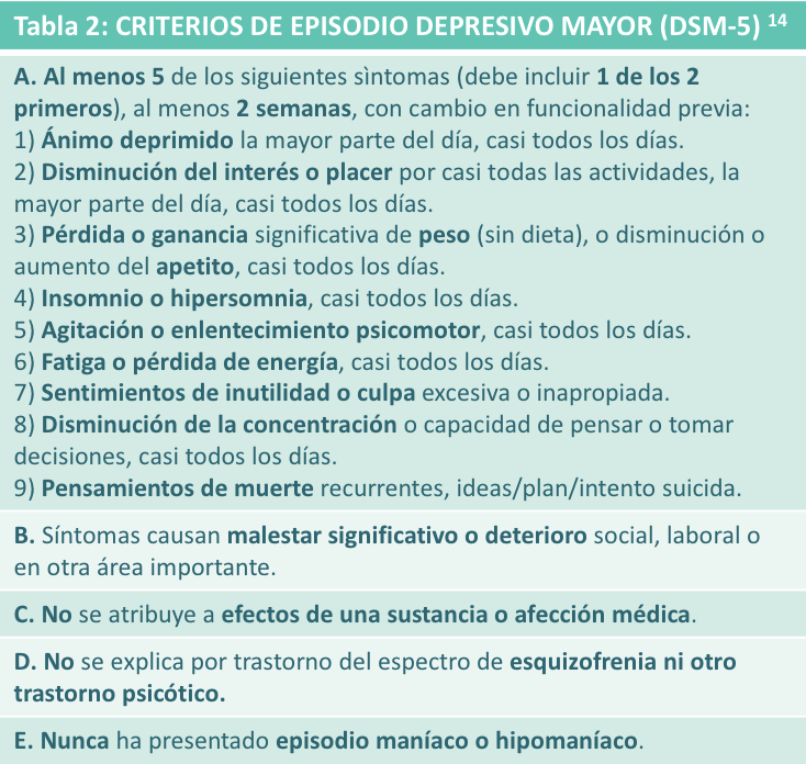Si bien el diagnóstico de la depresión en adultos mayores se realiza de acuerdo a los criterios DSM-5 (ver Tabla 2), hay ciertas particularidades en la forma de presentación: