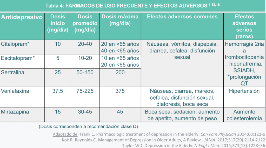 En adultos mayores se sugiere iniciar con dosis bajas, evaluar la tolerancia y respuesta, e ir aumentando en forma lentamente progresiva hasta lograr la dosis máxima recomendada, la remisión de síntomas o presentar efectos adversos (ver tabla 4), siempre verificando la tolerancia y adherencia a tratamiento (recomendaciones clase D).16