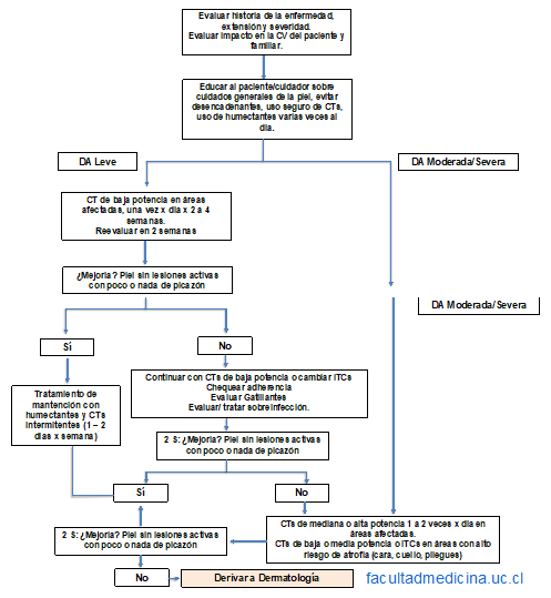 En relación con la severidad, existe un puntaje estandarizado denominado SCORAD 6, que evalúa 3 ítems (extensión, intensidad y síntomas subjetivos) en la superficie corporal, otorgando un puntaje final (Tabla 1). Existe una aplicación disponible para celulares de descarga gratuita y fácil aplicación. En el año 2007 se publicó la Guía Clínica NICE 7 que otorga una clasificación más holística, considerando la severidad de las lesiones al examen físico, pero también el impacto psicosocial y la calidad de vida. Cabe destacar que la severidad es un paso importante al momento de iniciar el manejo, pues dependiendo de ella se decidirá el tratamiento a realizar, y si éste puede ser realizado a nivel primario o debe ser derivado a especialista.