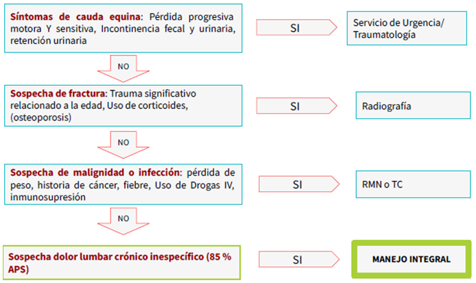 Esta entidad requiere una evaluación inicial con una anamnesis completa del dolor, un examen físico acorde, y el descarte dirigido de posibles banderas rojas.