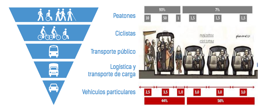 Es por esta razón que se ha propuesto una pirámide de movilidad urbana sustentable (figura número 1), donde se pone énfasis en aumentar los espacios públicos para peatones y ciclistas, siguiendo con más espacios para la locomoción colectiva y de carga, y dejando en el vértice de la pirámide los vehículos particulares. Esto se contrasta con la realidad actual donde todavía se prioriza el espacio para los vehículos particulares y se tiene un espacio reducido para los demás medios de transporte (15).