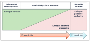 En el modelo observado en la figura 1, se promueve la identificación precoz de la situación de enfermedad avanzada que conducirá al final de vida, determinada por la primera transición, desde donde se realiza una aproximación paliativa progresiva. La segunda transición, dado por la situación de muerte próxima, determina un enfoque paliativo exclusivo, pero es mucho más tardío en responder a las diversas necesidades de los pacientes y sus familias.10,11