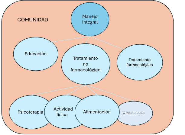 En la figura 2 se esquematizan los distintos componentes del tratamiento, todos insertos en un contexto comunitario en el que se encuentra el paciente: