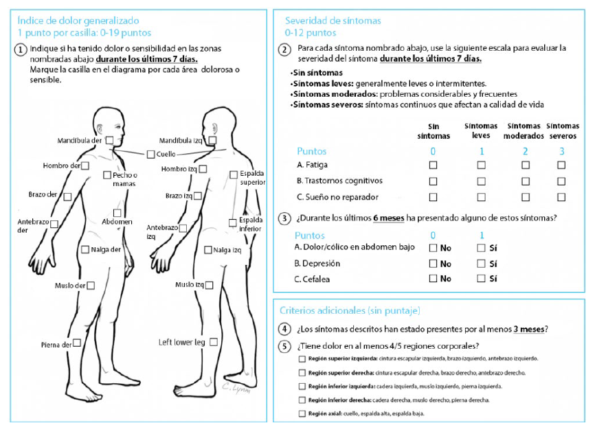 Figura 1: Criterios ACR 2016 para fibromialgia. Adaptado desde https://www.physio-pedia.com/The_American_College_of_Rheumatology_2010_preliminary_diagnostic_criteria_for_fibromyalgia