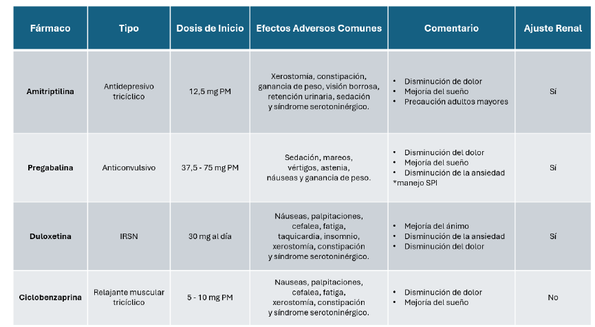 El tratamiento farmacológico para la fibromialgia se debe enfocar en la analgesia a través de un enfoque basado en los mecanismos del dolor. Los medicamentos que actúan centralmente, como los antidepresivos y anticonvulsivantes, son efectivos ya que aumentan la presencia de neurotransmisores inhibidores del dolor. Entre los antidepresivos, la duloxetina y amitriptilina tienen evidencia para disminución del dolor y podrían mejorar los síntomas anímicos, la ansiedad y el sueño. Los anticonvulsivantes, como la pregabalina, han sido aprobados para el tratamiento de la fibromialgia y son eficaces, aunque pueden causar efectos adversos, como mareos. Los relajantes musculares, como la ciclobenzaprina también pueden mejorar el dolor y la calidad de vida, especialmente en lo relacionado con el sueño. Otros analgésicos como paracetamol, opioides y los antiinflamatorios no esteroides, no son efectivos para la fibromialgia, pero pueden ser útiles en el tratamiento de dolores periféricos concomitantes que pueden agravar la sensibilización central (10). En la Tabla 1 se incluye una tabla a modo de resumen de los fármacos con más evidencia en el tratamiento de este síndrome.