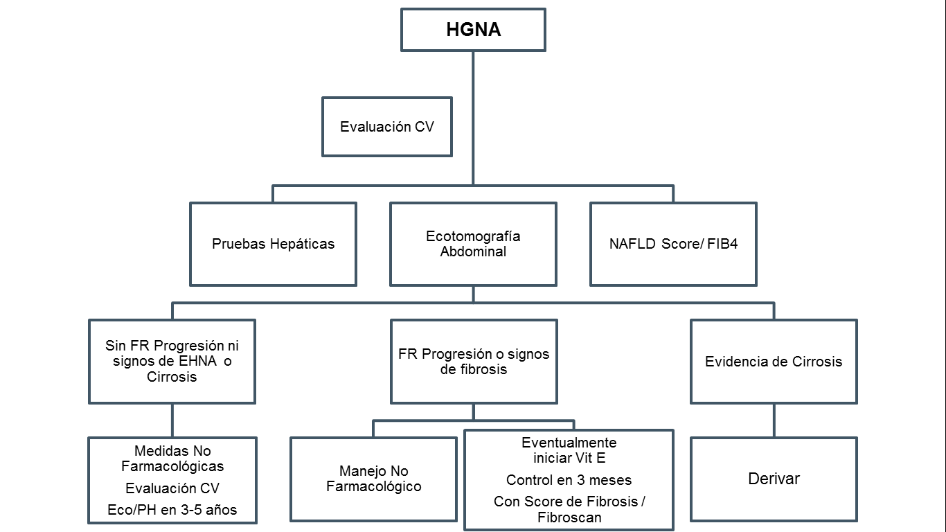 El HGNA es una enfermedad altamente prevalente que se asocia a riesgo de progresión de fibrosis en presencia de obesidad, hipertensión, diabetes y síndrome metabólico, patologías que a su vez han aumentado en su incidencia durante los últimos años. Es por esto que es de gran importancia la revisión de las herramientas que tenemos disponibles para el tratamiento y seguimiento de esta patología. Como pudimos analizar, las terapias farmacológicas disponibles son escasas y su recomendación es para un subgrupo específico. Es así como debemos potenciar, en la gran mayoría de los casos, las medidas no farmacológicas, las cuales apoyándonos en el equipo multidisciplinario disponible en APS, aumenta su efectividad.