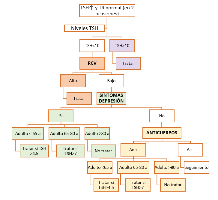 Frente a lo poco certera de la evidencia respecto al HSC, tanto sus asociaciones con complicaciones como la mejoría con el tratamiento; el clínico de APS debería evaluar el riesgo de progresión a hipotirodismo clínico (HSC severo y presencia de anticuerpos) y evaluar el RCV del paciente. La conducta de realizar tratamiento o seguimiento debiera ser siempre conversado con éste.