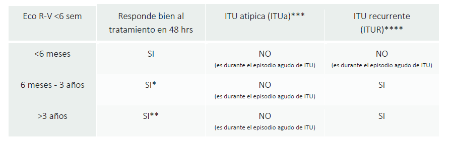 La tabla 1 resume las recomendaciones sobre la indicación de ecografía reno vesical tardía (no durante el episodio agudo de ITU) antes de las 4 a 6 semanas.