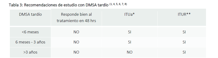 El cintigrama renal con TC 99 ácido dimercaptosuccínico (DMSA) diferido desde los 12 meses es el gold standard para el diagnóstico de cicatriz renal. La tabla 3 resume las recomendaciones sobre la indicación de DMSA tardío