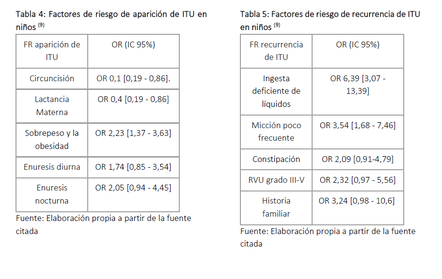Una revisión sistemática con metaanálisis del 2014 (8) con adecuada calidad metodológica, incluyó 9 estudios en pacientes de 0 a 18 años (6 observacionales y 3 ECA). El estudio realizó un seguimiento y un cintigrama renal (DMSA) al menos 5 meses después la primera ITU. La tabla 2 muestra los factores de riesgo asociados a una cicatriz renal en esa revisión y sus respectivos OR. Género y duración de la fiebre mayor de 24 horas no mostraron diferencias estadísticamente significativas.