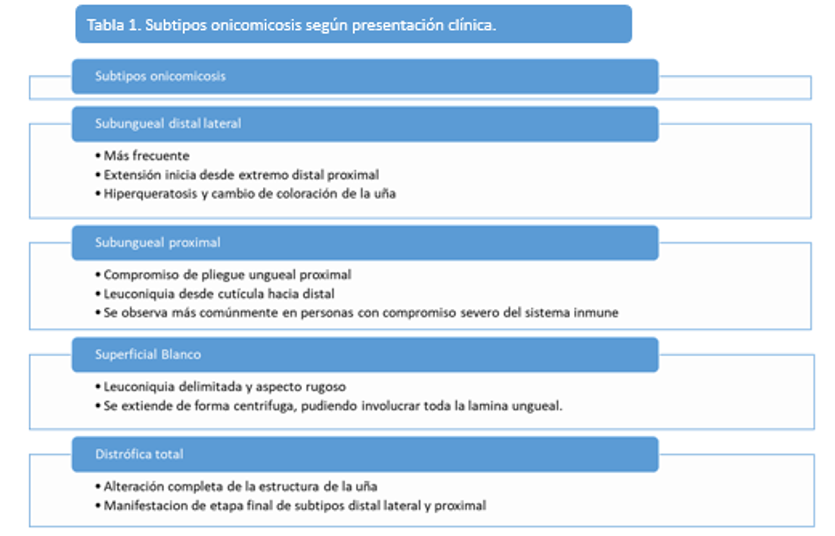 Al ser predominantemente asintomática, la consulta es generalmente tardía, lo cual permite la progresión de la onicomicosis y la generación de alteraciones importantes en el aparato ungueal. Dentro de los hongos causales se encuentran los dermatofitos, levaduras y del tipo moho no dermatofítica1. Infecciones por dermatofitos (Tinea unguium), son las más comunes y se estima que son el 60-70% de éstas2.