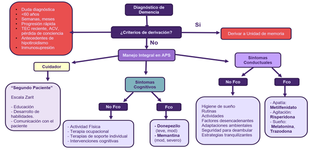 En base a lo expuesto, se entrega una propuesta de flujograma resumen (Imagen 1) para poder apoyar en la clínica el enfrentamiento del manejo integral del paciente con demencia y su familia.