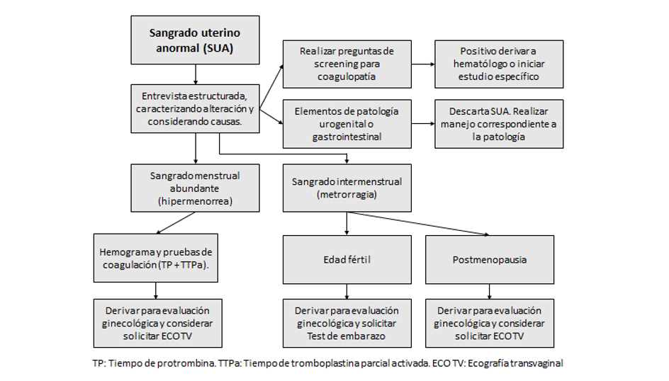 El estudio inicial luego de la entrevista y examen físico general debe incluir la realización de examen físico ginecológico adecuado, además de considerar exámenes como hemograma y pruebas de coagulación en sangrado menstrual abundante, prueba de embarazo y papanicolaou (si no está vigente) en mujer en edad fértil y ecografía transvaginal en mujer postmenopáusica o con sospecha de patología estructural.