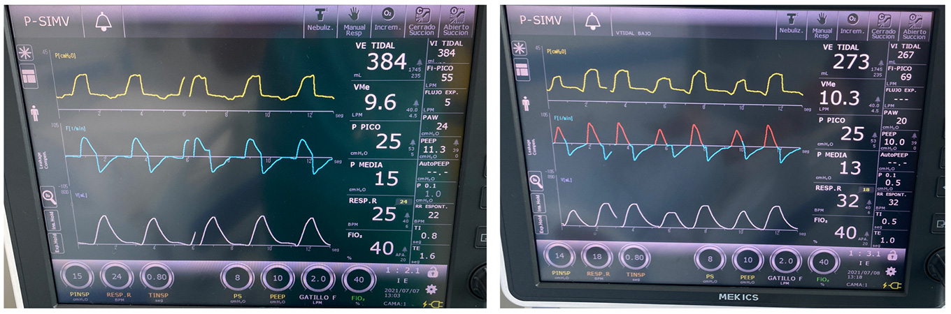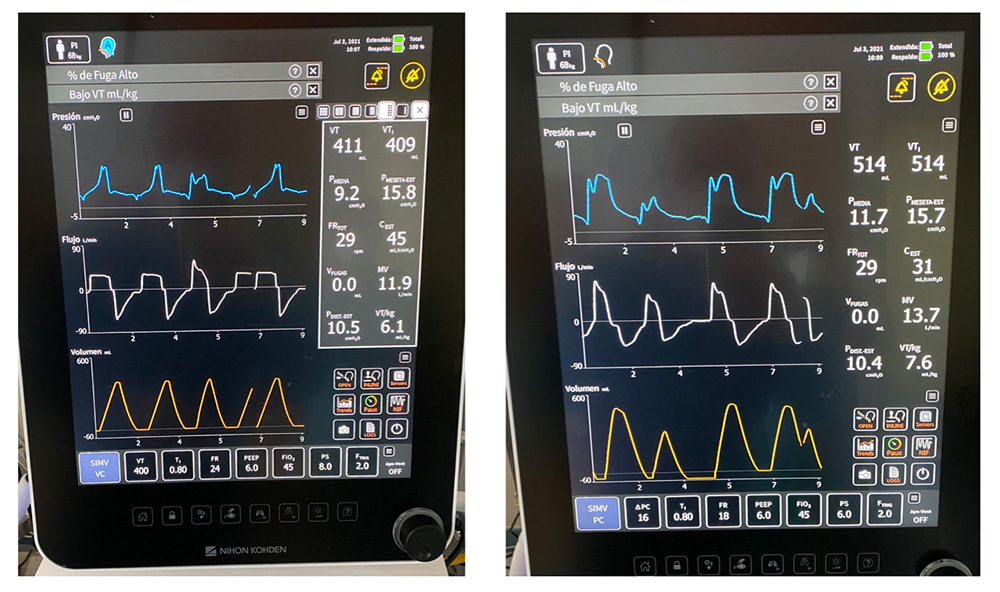 Figura 1: Modo IMV-VC con Vt 400, FR 24, y PS 8 cmH2O (panel izquierdo). Los ciclos controlados se identifican por el flujo cuadrado, mientras las presiones están amputadas por una clásica asincronía de flujo. Solo se identifica un ciclo asistido espontáneo, por el flujo desacelerativo. La asincronía de flujo se soluciona pasando a IMV-PC con PCV ∆16 cmH2O, manteniendo FR 24, y pudiendo disminuir PSV a ∆6 (panel derecho).