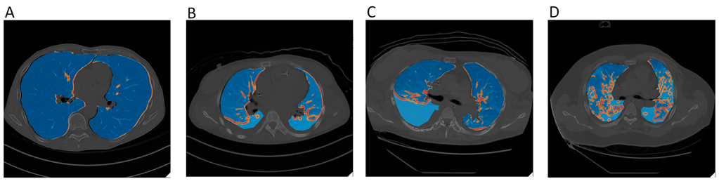 Figura: Imágenes en color de las heterogeneidades del pulmón superimpuesta sobre la tomografía computarizada de un sujeto del grupo control sano (A) y de pacientes con SDRA leve, moderado y severo (B, C y D). El color rojo representa zonas amplificadoras de estrés.