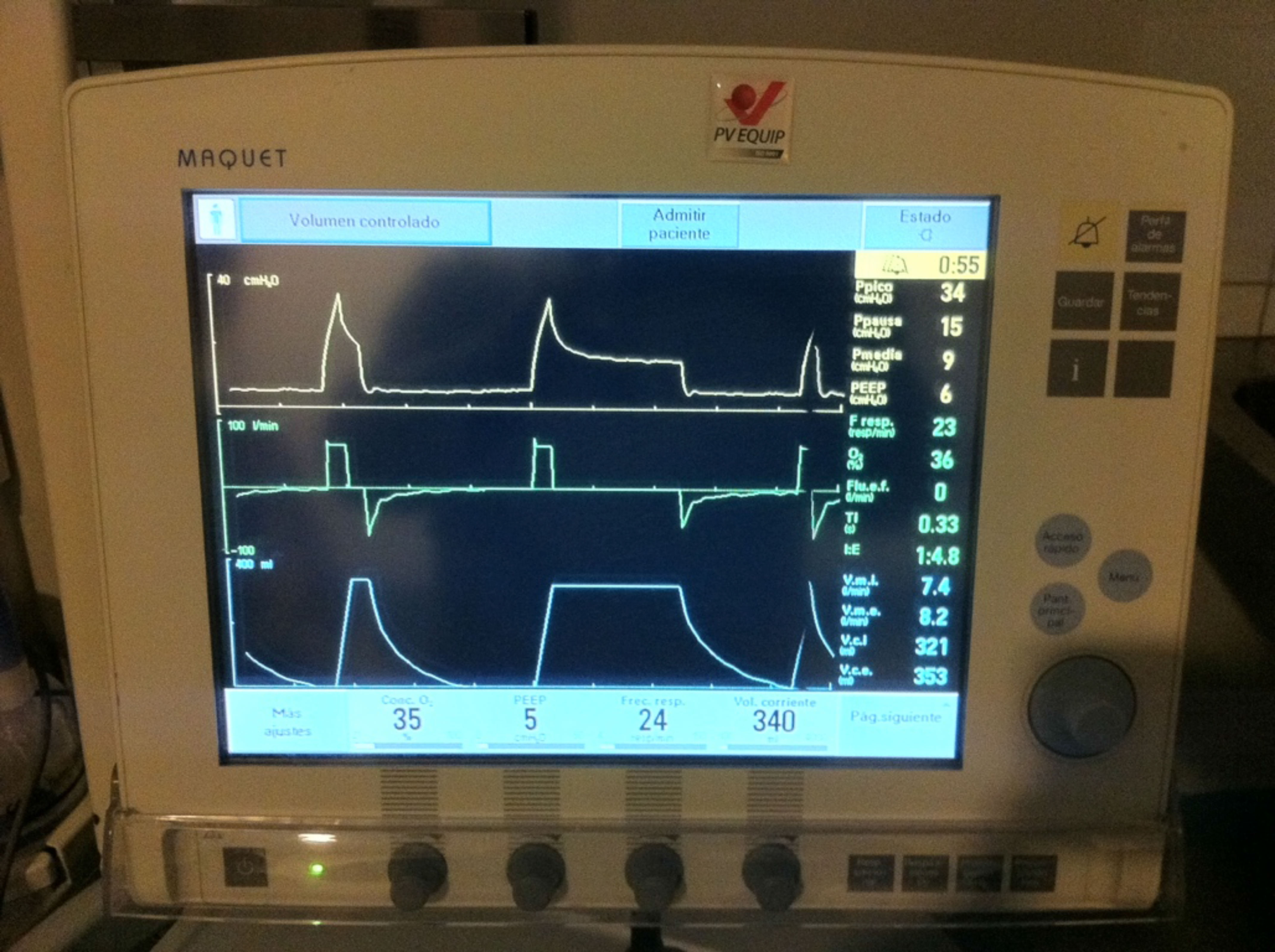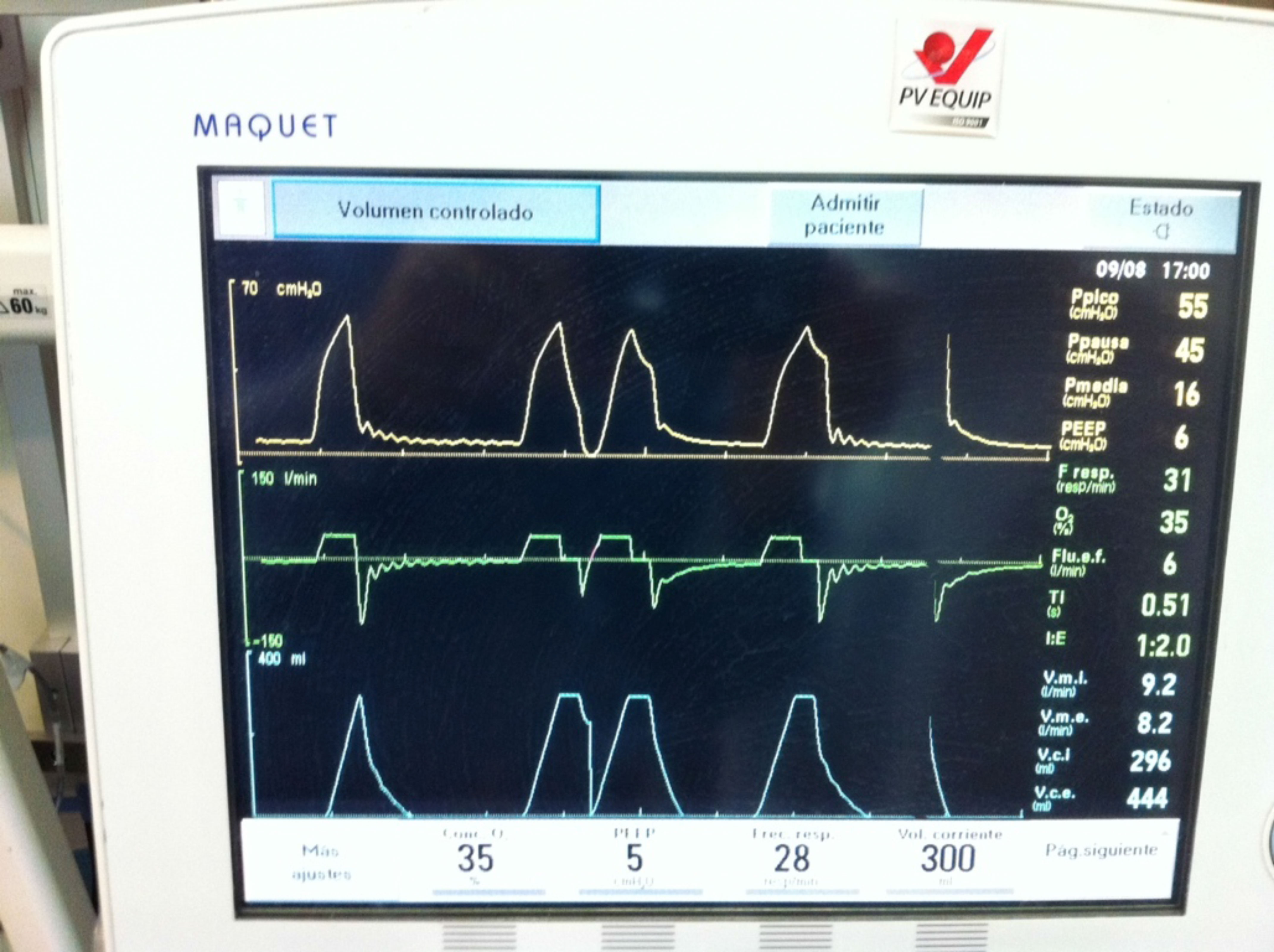 Estos gases son bastante ominosos dado que muestran acidosis, y una PaCO2 “falsamente normal”, dado que para su polipnea la paciente debería tener un CO2 bajo. Después de una hora en UCI, manteniéndose con nebulizaciones continuas y una nueva dosis de hidrocortisona, ya presenta una polipnea de 40 por minuto, con respiración paradojal por lo que se decide intubar y conectar a ventilación mecánica.