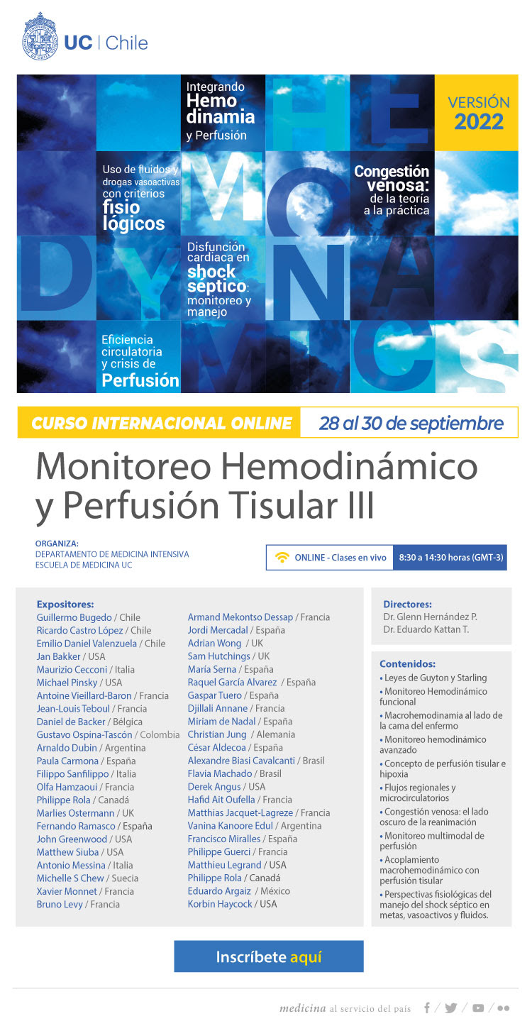 Después de casi 30 años de clínica, docencia e investigación en el área de la reanimación y el manejo del shock séptico, entre otras áreas, le invitamos al Curso Internacional de Monitoreo Hemodinámico y Perfusión Tisular en el Paciente Crítico, con destacados líderes de opinión a nivel mundial. Este curso será realizado en una modalidad online, entre el 28 y 30 de septiembre, pero podrá ser vista posteriormente en forma asincrónica.
