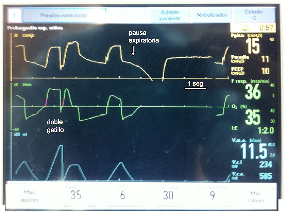 Figura: Paciente en VCP: ∆P 9 cmH2O, FR 30 y PEEP 6 cmH2O, con trabajo ventilatorio aumentado. Al hacer una pausa expiratoria (flecha), se aprecia un gran esfuerzo inspiratorio y que dura más de un segundo, muy probable causa de su doble gatillo.