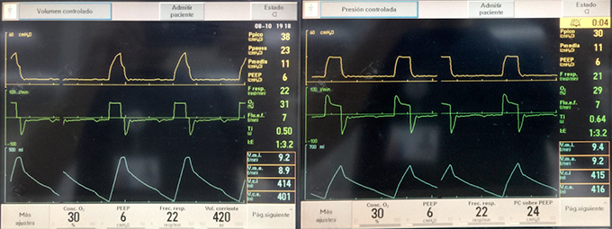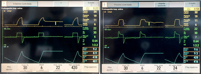 En modo PCV, para lograr Vt cercano a 420 ml, se programó ∆P 24 (presión sobre el PEEP), sin cambios en FR, PEEP, o FiO2. La pantalla presenta Ppico 30 y Pmedia similar, 11 cmH2O (Figura 1, derecha).