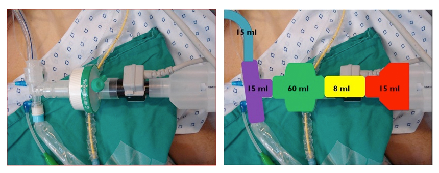 Esta figura ilustra los volúmenes aproximados del espacio muerto instrumental (sistema de aspiración, filtro HMEF y capnógrafo) antes de conectar con las mangueras del ventilador.