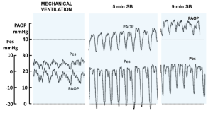 Figura: Registros de presión esofágica (Pes) y presión de arteria pulmonar enclavado (PAOP) durante ventilación mecánica, y a los 5 y 9 minutos de iniciada la prueba de ventilación espontánea en “T”. El gran aumento en la PAOP (de 40 mmHg) es reflejo de una disfunción ventricular izquierda, con edema pulmonar y aumento del trabajo ventilatorio (aumento en las deflexiones negativas en la Pes). Modificado de Lemaire F, et al. Anesthesiology 1988; 69: 171-179.
