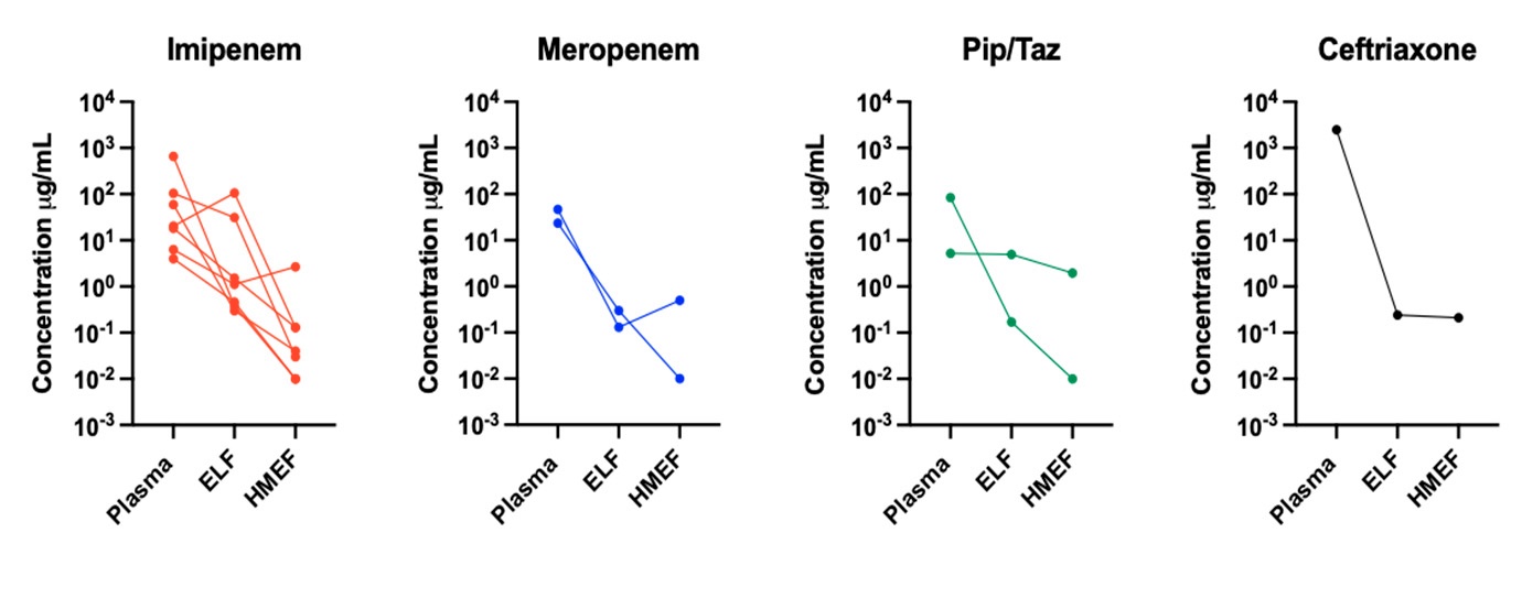 Realizamos un estudio clínico observacional en 12 pacientes inmunosuprimidos en ventilación mecánica con sospecha de neumonía, a quienes se les realizó una LBA como método diagnóstico. Estos pacientes recibieron simultáneamente antibióticos betalactámicos como parte de su régimen de tratamiento. Se hicieron mediciones simultáneas en el EBC del HMEF, y en el ELF y en el plasma al momento de la realización del LBA.