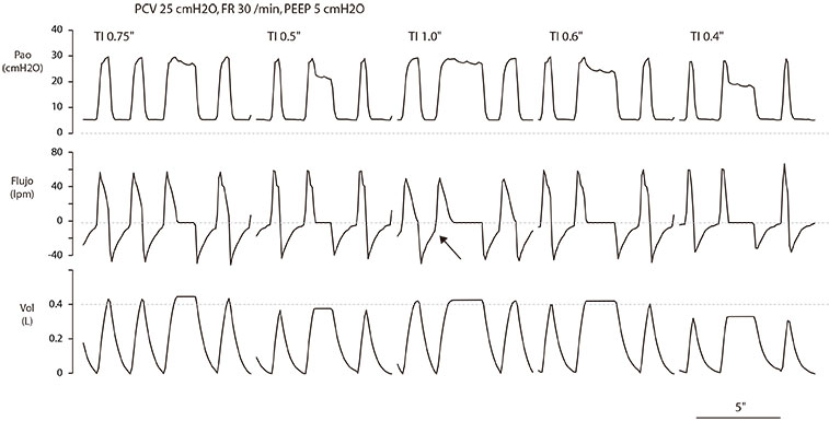 Figura: Gráficos de flujo, presión y volumen en una paciente de 35 años, portadora de una fibrosis pulmonar y una neumonía por P. jirovecii. Este ejercicio se hizo para optimizar su ventilación. En todo momento, la paciente está en VCP con ∆P 25 cmH2O, frecuencia de 30 ciclos por minuto (ciclo ventilatorio de 2 seg), y PEEP 5 cmH2O. Sólo se varía el tiempo inspiratorio (TI) de 0.75 seg (basal) a 0.5, 1.0, 0.6 y 0.4 seg. Por tanto, en todos los casos también hay cambios en la relación I:E, observándose mayor autoPEEP a TI de 1.0 seg (flecha), y prácticamente sin autoPEEP a TI 0.4 seg. Además, en todos los casos se hace un pausa inspiratoria, con lo cual vemos que varía la presión de distensión (presión meseta menos PEEP), pese a tener el mismo ∆P programado. A menor presión de distensión hay menor volumen corriente (Vt). Esta regla no se cumple a TI 1 seg, pues el autoPEEP produce atrapamiento de aire, aumento del PEEP total y caída de la presión de distensión en relación a TI de 0.75 seg.