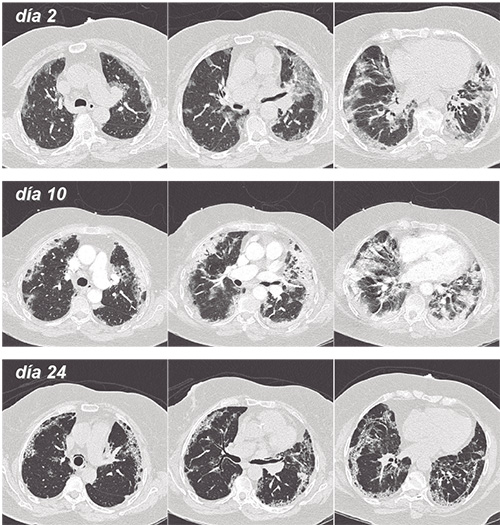Figura: Tomografía computarizada en mujer de 76 años con PCR (+) para SARS-CoV-2, y que ingresa por insuficiencia respiratoria, recibiendo dexametasona (protocolo Recovery), y siendo apoyada con CNAF por varias semanas. Al segundo día de su ingreso se evidencia extensas opacidades parenquimatosas de relleno alveolar bilaterales y de predominio periférico. A la semana siguiente (día 10) se aprecia mayor compromiso y engrosamiento inter e intralobulillar, y posteriormente (día 24) hay áreas de reticulación irregular subpleural y bronquiectasias por tracción, siempre con la misma distribución anatómica.
