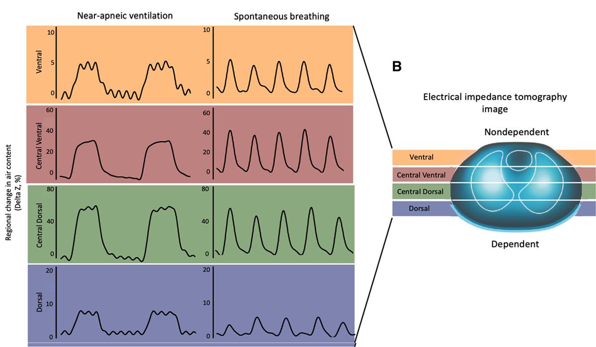 Figura: Formas de onda representativas de tomografía de impedancia eléctrica (EIT) durante la ventilación cuasi-apneica (izquierda) y respiración espontánea (derecha), y representación esquemática de la imagen de EIT y las regiones de interés (ROI) analizadas.