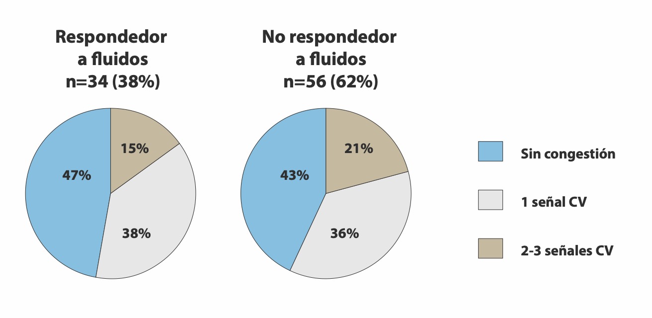 Figura: Prevalencia de señales de congestión venosa (CV) en aquellos pacientes que responden y que no responden a fluidos.